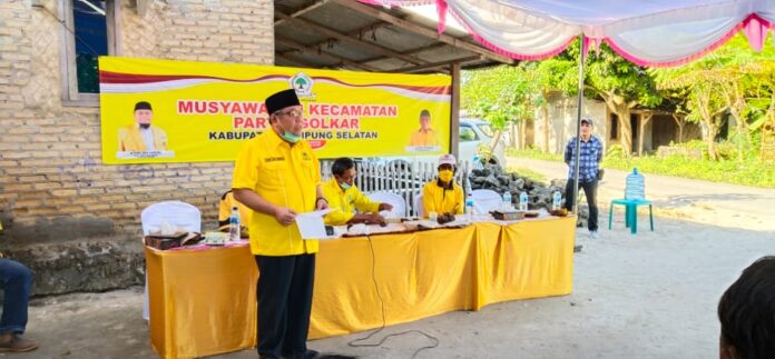 KALIANDA–Ketua DPD Partai, Golkar Lamsel, H. Tony Eka Candra melantik langsung Ketua Pimpinan Kecamatan (PK), Didinsyah, SH di Desa Ketapang Kecamatan Ketapang, Lampung Selatan. Usai melantik, Tony berpesan agar pengurus PK untuk secepatnya bekerja, dan sehera membentuk Pimpinan Desa (PD) di 17 desa kecamatan setempat. “Muscam dan pembentukan PD ini merupakan printah wajib yang tercatat dalam AD/ART Partai Golkar, untuk PK segera bekerja dan berkoordinasi untuk kemenangan partai golkar di kecamatan ketapang ini,” ucap Ketua DPD Partai Golkar Lamsel, Tony Eka Candra, Senin (22/3)