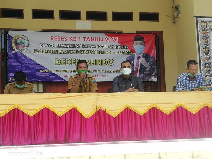 LAMPUNG SELATAN, – Anggota DPRD Lamsel, Komisi III Deden Alindo, A.Md melakukan reses ke 1 (pertama) tahun 2021, acara tersebut di gelar di Halaman Kantor Desa Kedaung Kecamatan Sragi, Kabupaten Lampung Selatan, Senin (19/04/2021).