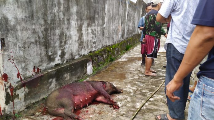 Di duga babi hutan yg berwarna gelap tersebut turun dari pegunungan yg memang tidak jauh dari pemukiman warga setempat hingga memasuki pekarangan rumah warga