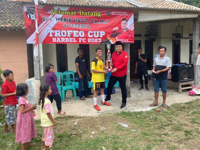 lamsel– Kepala Badan Bantuan Hukum dan Advokasi Rakyat (BBHAR) DPC PDI Perjuangan Lampung Selatan Merik Havit, SH., MH., menyelenggarakan acara pertandingan sepak bola Trofeo Cup Barbel FC 2023 U-17