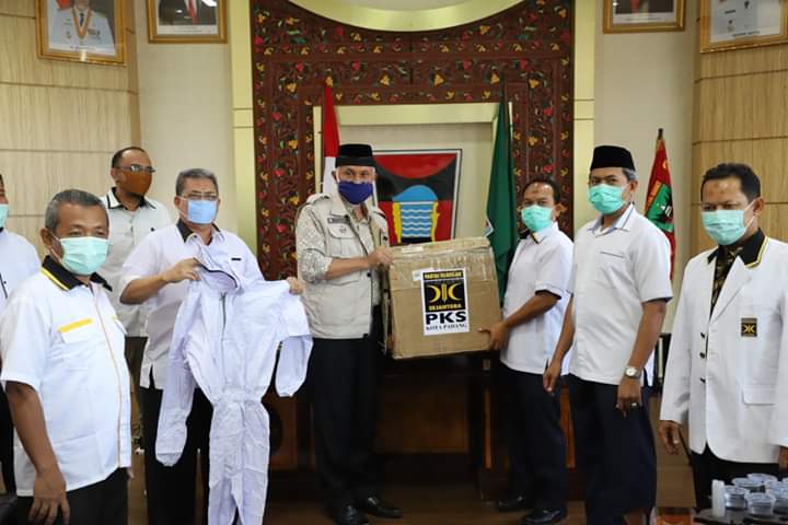 Farksi PKS DPRD Kota Padang menyerahkan bantuan Alat Pelindung Diri (APD) berupa 47 hazmat dan 39 masker. Bantuan tersebut diserahkan langsung oleh Ketua Fraksi PKS DPRD Kota Padang Muharlion kepada Wali Kota Padang Mahyeldi Ansharullah di Balaikota Padang, Kamis (9/4/2020).