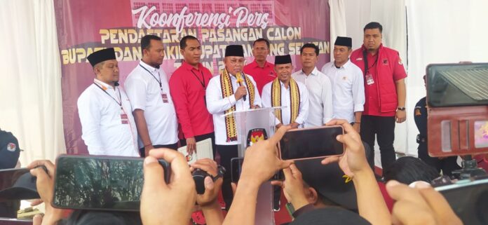 KALIANDA- Sedikitnya, ada lima ribuan pendukung bakal calon Bupati Lamsel H. Nanang Ermanto dan Wakilnya Antoni Imam, SE, ikut mengantar kedua pasangan bakal calon daftarkan ke KPU Lamsel. Massa yang tidak terbendung itu datang dari berbagai pelosok wilayah Lamsel membuat lapangan cipta karya Kalianda dipenuhi pasukan warna merah. LO pasangan calon Nanang-Antoni Patra Oki Agung Riyanto menyatakan kehadiran massa pendukung yang semula dijadwalkan hanya 2500 orang, berubah naik ada sebanyak 5000 massa yang ikut hadir untuk menghantarkan bakal calonnya Nanang-Antoni daftar ke KPU, hari ini. “Ini menunjukkan antusias warga Lamsel yang begitu besar untuk tetap melanjutkan pemimpin yang merakyat, berkualitas, dan dicintai banyak orang. Secara pribadi, saya mohon maaf karena begitu banyaknya massa yang ikut hadir menghantarkan langsung pemimpinnya daftar KPU. Semua ini sebagai bentuk kegembiraan warga karena pemimpin yang dicintainya akan melanjutkan memimpin di Lamsel,” sebut pria yang akrab disapa Bung Oki, saat berikan sambutannya dalam pendaftaran Nanang-Antoni di kanto KPU Lamsel, Kamis (29-8_2024).