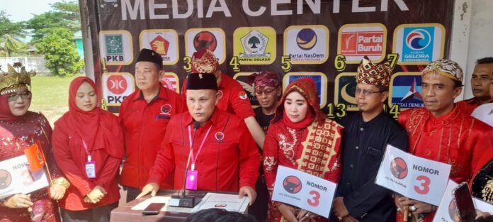 KALIANDA– Merajut kebudayaan dan adat istiadat di Lampung Selatan, dalam bingkai khebinekaan, menjadi tema yang ditonjolkan Partai Demokrasi Indonesia Perjuangan (PDIP) Lampung Lampung Selatan, saat menyerahkan daftar Bacaleg di Kantor KPU setempat, Kamis pagi (11/5/2023). Rombongan PDIP Lamsel yang dipimpin langsung oleh Ketua DPC PDIP Lamsel, H. Nanang Ermanto dan Sekretarisnya Syahirul Alim, SH, MH, datang ke KPU, sesuai jadwal tepat pukul 09.00 WIB.