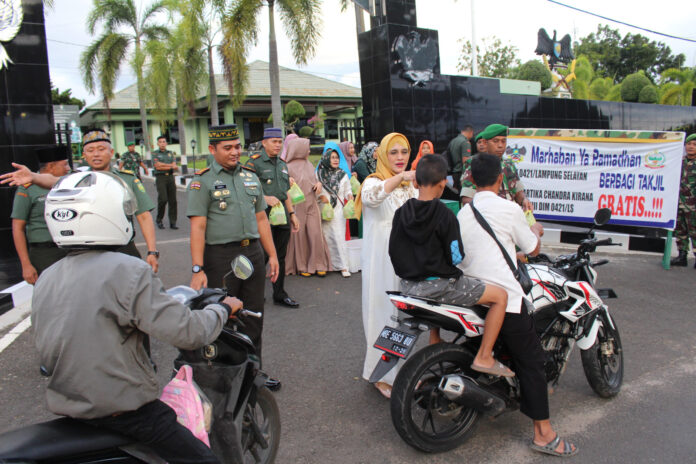 Pembagian takjil dipimpin langsung oleh Komandan Kodim 0421/Ls Letkol Inf Fajar Akhirudin S.I.P.,M.Si., bersama Ketua Persit KCK Cabang XXXIII diikuti oleh anggota dan Persit Kodim 0421/Ls. Pada kesempatan itu, Dandim 0421/Ls mengatakan bahwa kegiatan tersebut rutin diadakan setiap hari di Bulan suci Ramadhan untuk saling berbagi kepada masyarakat. Kegiatan ini salah satu agenda sosial Kodim 0421/Ls yang sudah direncanakan, berupa bagi-bagi takjil gratis dan merupakan bentuk kepedulian kepada masyarakat, khususnya warga muslim yang saat ini sedang menunaikan ibadah puasa,” ucap Dandim