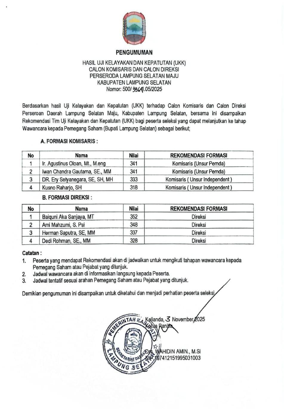 Sebagaimana diketahui, sesuai pengumuman Uji Kelayakan dan Kepatutan bernomor 500/99641.05/2025 telah dinyatakan lolos seleksi untuk calon Komisaris sebanyak 4 calon Komisaris, yakni dua calon dari unsur Pemda dan dua calon dari unsur independen.