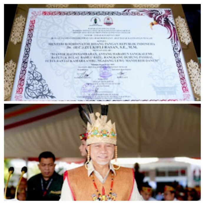 Dikutif dari media online mediasamud ranasional.com, pemberian gelar tersebut berdasarkan Surat Keputusan Pengurus Dewan Adat Dayak Kalimantan Tengah yang ditandatangani oleh Ketua Umum Dewan Adat Dayak sekaligus Gubernur Kalimantan Tengah Agustiar Sabran. Gelar diberikan saat apel bersama kepala desa, babinsa, bhabinkamtibmas, dan damang di Palangka Raya, Kalimantan Tengah, hari ini. Saat proses pemberian gelar, Zulhas memakan baju dan ikat kepala khas Dayak serta diberi mandau.