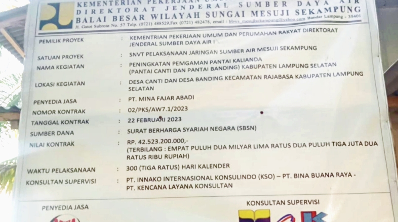 Sebelumnya diberitakan, kegiatan konstruksi Peningkatan Pengaman Pantai Kalianda (Pantai Canti dan Pantai Banding) senilai Rp42.523.200.000,- dari Pelaksanaan Jaringan Sumber Air (PJSA) Balai Besar Wilayah Sungai Mesuji Sekampung (BBWS-MS) terancam mangkrak.