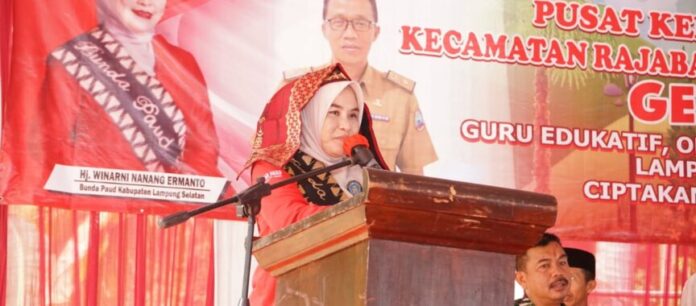 LAMSEL, Rajabasa – Bunda PAUD Kabupaten Lampung Selatan Hj. Winarni Nanang Ermanto menghadiri dan membuka kegiatan Gebyar PAUD Kecamatan Rajabasa, Sabtu (27/05/2023).