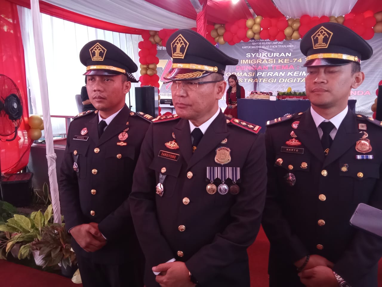 KALIANDA- Perayaan HUT Imigrasi ke 74 berjalan sukses. Dalam peringatan HUT ke 74 itu, Kepala Kantor Inigrasi kelas 3 di Lampung Selatan (Lamsel) Sugiyono berharap dapat selalu memberkan pelayanan terbaik untuk masyarakat, baik itu layanan paspor maupun layanan izin tinggal bagi orang asing. Hal ini dikatakan Kepala Imigrasi Kelas 3 Lampung Selatan Sargiyono, saat jumpa pers di hari puncak perayaan HUT Imigrasi yang ke 74 di halaman kantor setempat, Jumat (26-1-2024). Dalam penjelasannya, Sargiyono mengatakan rangkaian peringatan HUT Imigrasi yang ke 74 ini, diawali dengan pemberian layanan paspor simpatik. Yakni, pelayanan paspor untuk masyarakat yang dilakukan dalam rangka peringatan hari bhakti imigrasi, yakni layanan paspor di hari libur, pada hari Sabtu. “Setelah layanan paspor simpatik, rangkaian kegiatan HUT dilanjutkan dengan kegiatan kunjungan ke panti sosial, donor darah, tabur bunga ke mahkam pahlawan dan upacara Hari Bhakti yang ke 74,” jelas Kepala Imigrasi kelas III Kalianda, Lamsel ke para awak media.