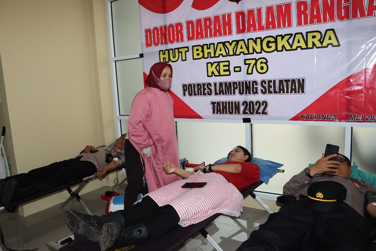 Kasi Dokkes Polres Lampung Selatan Ipda dr Chantika Tara mewakili Kapolres Lamsel AKBP Edwin SIK, SH, MSi, Selasa (31/5/2022) menjelaskan bahwa pelaksanaan kegiatan Bhakti Sosial berupa Donor Darah dalam rangka HUT Bhayangkara ke 76 tahun 2022 diikuti sebanyak 102 personil Jajaran Polres Lampung Selatan.