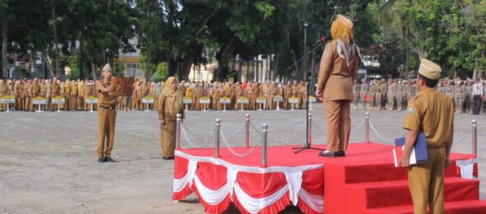 KALIANDA– Asisten Bidang Pemerintahan dan Kesejahteraan Rakyat (Kesra) Kabupaten Lampung Selatan, Eka Riantinawati memimpin apel mingguan di lingkungan Pemkab Lampung Selatan, Senin (05/12/2022).