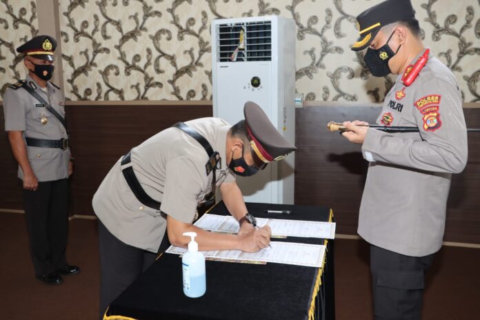 Kepolres Lampung Selatan AKBP Edwin, SIK, MSi memimpin serah terima jabatan (Sertijab) Kabag Ops Polres Lampung Selatan, Senin (29/11/2021) di Aula GWL Polres Lampung Selatan.