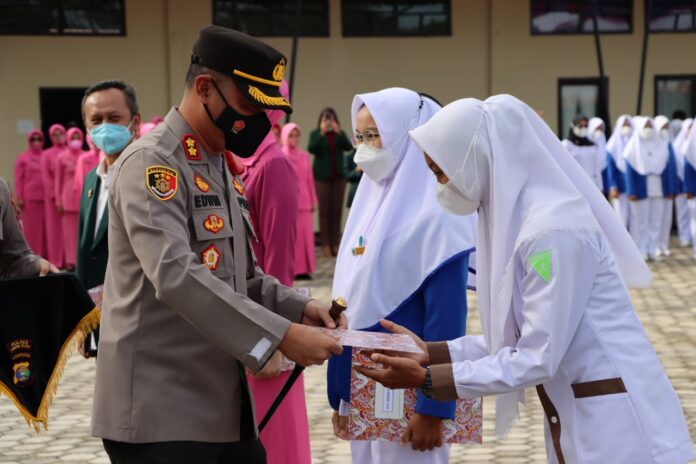 Kapolres Lampung Selatan AKBP Edwin, SIK, SH, MSi memberikan penghargaan kepada para Relawan Kesehatan Bhayangkari, Tenaga Kesehatan (Nakes) Ikatan Dokter Indonesia (IDI), Mahasiswa dan Bidang yang telah membantu mensukseskan pelaksanaan Vaksinasi di Kabupaten Lampung Selatan.