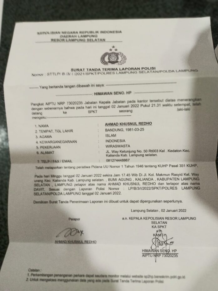 KALIANDA—Kasat Reskrim Polres Lampung Selatan, AKP Hendra Saputra mendampingi Kapolres Lamsel menyatakan tetap akan memproses hukum setiap laporan pengaduan warga. Termasuk, laporan pengaduan penganiayaan dan pengeroyokan yang dialami korban Ahmad Khusnul Ridho (41) warga Desa Kedaton, Kalianda, Lamsel. Dalam laporannya bernomor LP/B/3/1/2022/SPKT/POLRES LAMSEL tertanggal 2 Januari 2022, disebutkan korban penganiayaan dan pengeroyokan berstatus sebagai seorang wartawan.