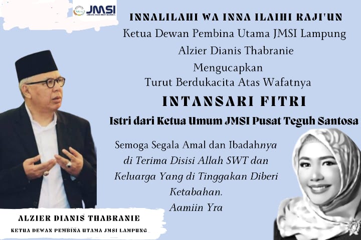 NEWSLAMPUNG.CO — Ketua Dewan Pembina Utama JMSI Provinsi Lampung, Alzier Dianis Thabranie Mengucapkan Turut Berdukacita Atas Meninggalnya Istri Ketua Umum JMSI.