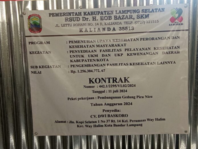 Seperti telah diberitakan sebelumnya, proyek pembangunan gedung Picu Nicu RSUD Bob Bazar menggunakan anggaran tahun 2024 dengan nilai anggaran 1,2 M. Proyek yang dikerjakan oleh CV Dwi Baskoro alamat Jln Kopi Selatan Perumnas Way Halim Bandar Lampung tersebut tidak selesai 100%. Namun, diperkirakan pembangunannya baru mencapai 40-50% saja. Terkait gedung yang mangkrak itu, Direktur RSUD Bob Bazar Kalianda belum memberikan penjelasan resmi. Berulang kali, Sang Direktur RSUD dr. Renny Indriyani dan PPK proyek bermasalah tersebut sulit ditemui dan menutup diri.