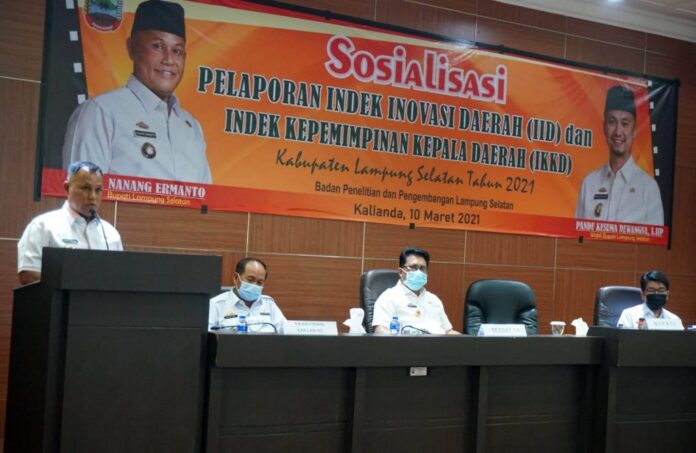 Demikian pesan moral yang disampaikan Kepala Badan Penelitian dan Pengembangan Daerah (Balitbangda) Provinsi Lampung, Ir. Hamartoni Ahadis, M.Si dalam sambutannya pada acara Sosialisasi Pelaporan Indek Inovasi Daerah (IID) dan Penilaian Indek Kepemimpinan Kepala Daerah (IKKD) Kabupaten Lampung Selatan Tahun 2021.