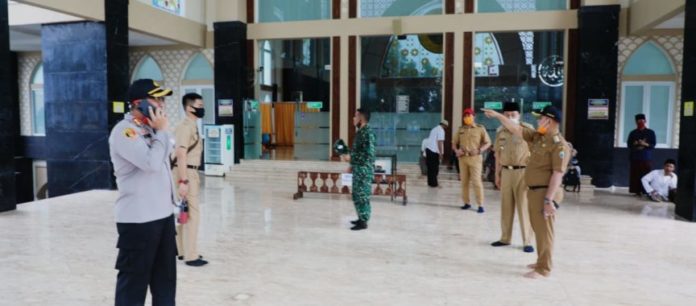 KALIANDA – Bupati Lampung Selatan, H. Nanang Ermanto bersama Komandan Kodim 0421 Letkol (Kav). Robinson Octavianus Bessie dan Kapolres Lampung Selatan AKBP. Edi Purnomo lakukan inspeksi mendadak (Sidak) terkait kesiapan rumah ibadah menjelang New Normal di Masjid Agung Kalianda. Senin (8/6/2020).