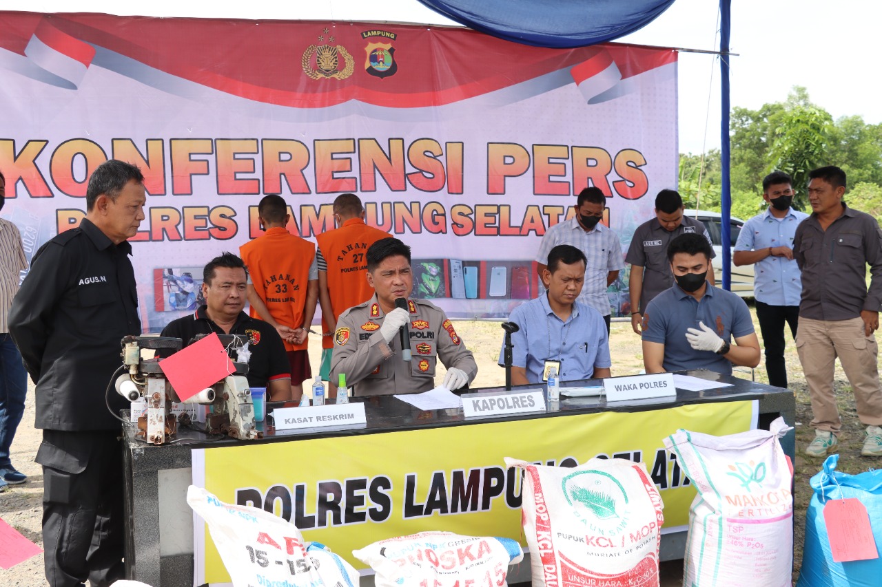 Pelaku yang diamankan yakni sdr. FR(24) warga Ds. Sukajaya Lempasing Kec. Teluk Pandan Kab. Pesawaran, AC (44) warga Kel. Kalang Sari Kec. Rengas Dengklok Kab. Karawang, Jawa Barat dan AS masih dalam pengejaran. Barang bukti yang berhasil diamankan 45 ton pupuk palsu, 1 unit mobil truck, 2 unit mesin molen, 1 penggilingan, 2 unit mesin jahit karung, alat ayakan dan bahan – bahan pembuat pupuk palsu.
