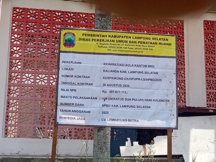 KALIANDA- Proyek pembangunan penunjukkan langsung yang dikerjakan CV Lembayung Sutra, dengan pengerjaan rehab aula kantor BKD Lamsel, jadi perhatian publik. Apalagi, proyek PL itu memiliki nilai kontrak Rp. 397, 077.112.
