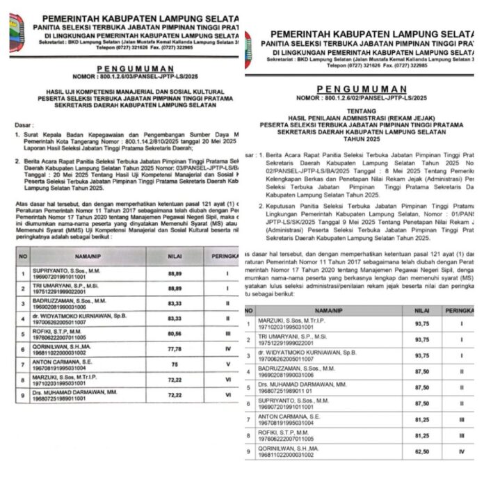 Ketiga kandidat yang mampu mendapatkan nilai yang stabil, berdasarkan hasil pengumuman resmi gelombang pertama dan gelombang kedua, disebut sebut berpeluang besar menjadi calon terkuat Sekda Lamsel. Ketiganya adalah Tri Umaryani SP MSi, dr. Widiatmoko Kurniawan Sp. B. dan Badruzzaman SSos MM. (asof)