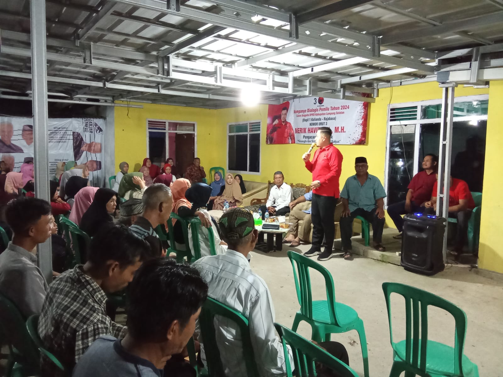 KALIANDA- Ratusan warga Desa Canggu Kalianda, kompak berteriak coblos nomor 3 Merik Havit, SH MH. Yel yel Merik Havit menang berkali kali menggema seantero halaman rumah warga desa setempat yang dijadikan lokasi kampanye Caleg Kabupaten Lamsel Dapil 1 Kalianda Rajabasa dari PDIP tersebut, Rabu (7/2-2024).