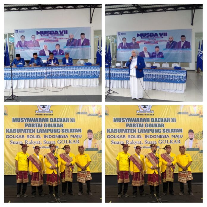 KALIANDA – Meski dalam satu koalisi sama sama mendukung penuh kebijakan pemerintahan Prabowo, yang Pro Rakyat. Juga, sama sama dibuka oleh Wakil Bupati Lamsel H. Syaiful Anwar ST. Namun, ada nuansa yang berbeda dalam pelaksanaan Musda DPD Partai Golkar Lamsel dengan Musda di DPD PAN Lamsel. Jika Musda Golkar tampilkan nuansa budaya Lampung, sedangkan Musda PAN tampilkan nuansa budaya qosidahan ibu ibu. Perbedaan ini terlihat jelas ketika penyambutan kehadiran pimpinan partainya masing masing. Meski begitu, pelaksanaan Musda kedua partai tersebut berjalan sukses.