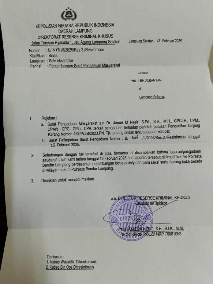 Kasubdit W/Tipidkor Ditreskrimsus Polda Lampung, Komisaris Polisi Yustam Dwi Heno, S.H., S.I.K., M.M., dalam surat resminya menyatakan bahwa laporan tersebut telah diterima pada 18 Februari 2025. “Berdasarkan pertimbangan locus delicti, serta lokasi saksi dan barang bukti, laporan ini telah dilimpahkan ke Polresta Bandar Lampung,” tulisnya dalam surat bernomor B/88/V/2025/Res.3./Reskrimsus.