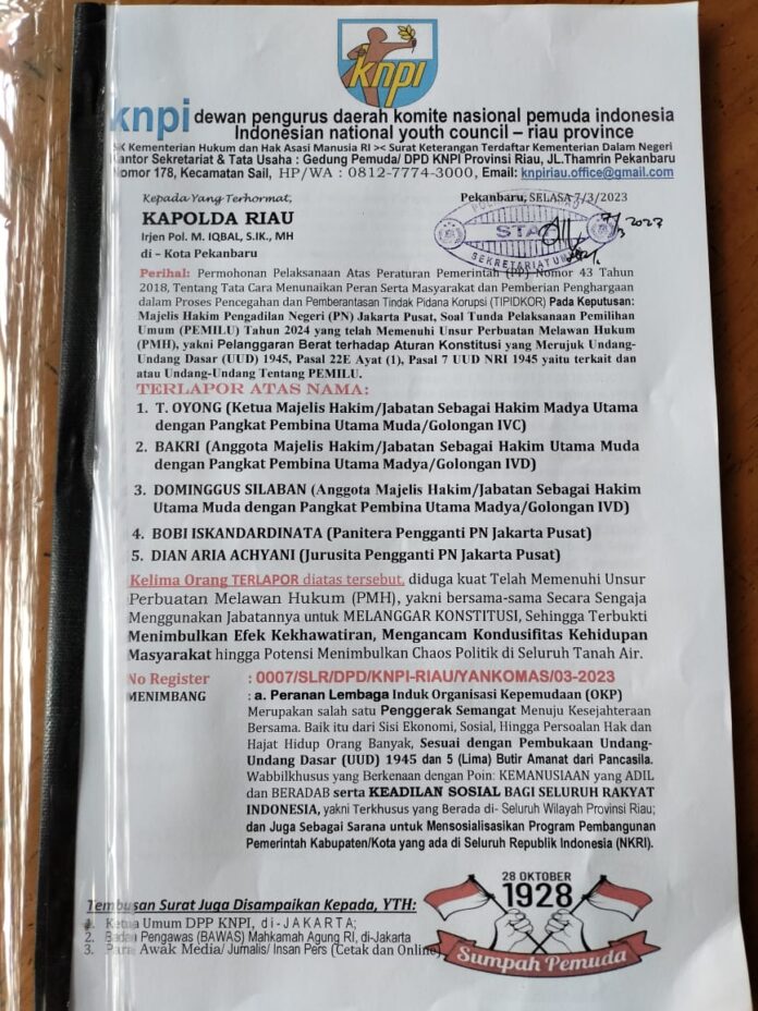 Bertempat di Kantor Sentra Pelayanan Kepolisian Terpadu (SPKT) Kepolisian Daerah (Polda) Riau, Hari ini Selasa (7/3/2023) Dewan Pengurus Daerah (DPD) Tingkat I, Komite Nasional Pemuda Indonesia (KNPI) Provinsi Riau Melaporkan Para Hakim beserta Perangkat di PN Jakarta Pusat, yang Memutuskan Penundaan Pelaksanaan Pemilu tahun 2024 yang akan datang, yang jelas-jelas terbukti memenuhi unsur Perbuatan Melawan Hukum (PMH).