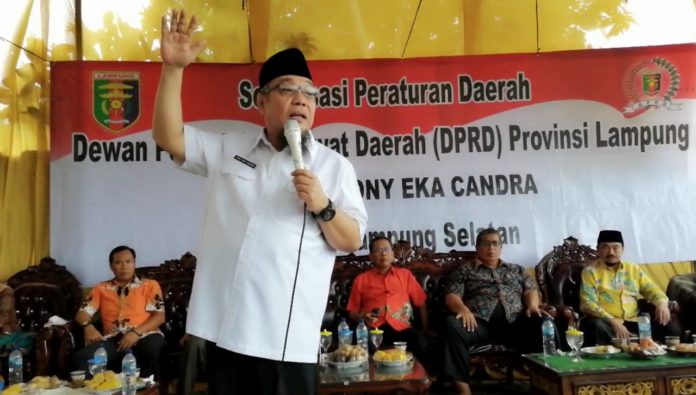 Salah satunya adalah Anggota DPRD Provinsi Lampung H. Tony Eka Candra (TEC). Politisi senior Partai Golkar Lampung ini mengajak Drs. Rusfian Effendi, MIP sebagai pemateri guna melaksanakan Sosialisasi Perda (Sosper) Provinsi Lampung Nomor 1 Tahun 2016 di Desa Gedung Agung Kecamatan Jati Agung Kabupaten Lampung Selatan, Minggu (15/3/2020).