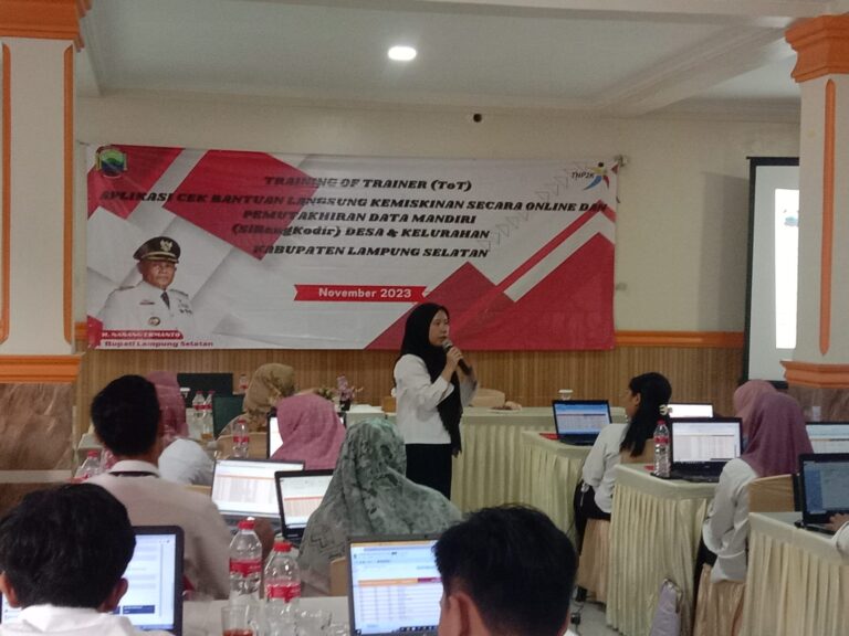 Alhasil, setidaknya sebanyak 256 operator desa dan 4 kelurahan se-Kabupaten Lampung Selatan mendapat Training Of Trainer (TOT) aplikasi SiBangKodir atau aplikasi Cek Bantuan Bantuan Langsung Kemiskinan Secara Online dan Pemuktahiran Data Mandiri. Kegiatan ini dilakukan secara maraton dan bertahap sesuai dengan lokasi wilayah kecamatan.