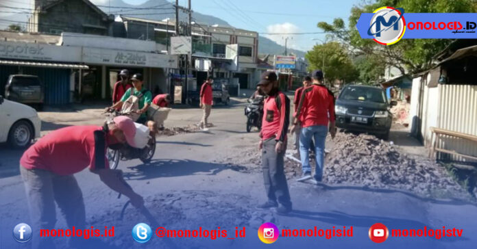 LAMPUNG SELATAN – Dinas Pekerjaan Umum dan Perumahan Rakyat (PUPR) Kabupaten Lampung Selatan melalui Unit Pelaksana Teknis Pengujian Konstruksi Bangunan (UPT PKB) Kecamatan Kalianda melaksanakan gotong royong penenimbunan jalan berlubang di Jalan Radin Inten, jembatan pensil pasar inpres Kalianda.